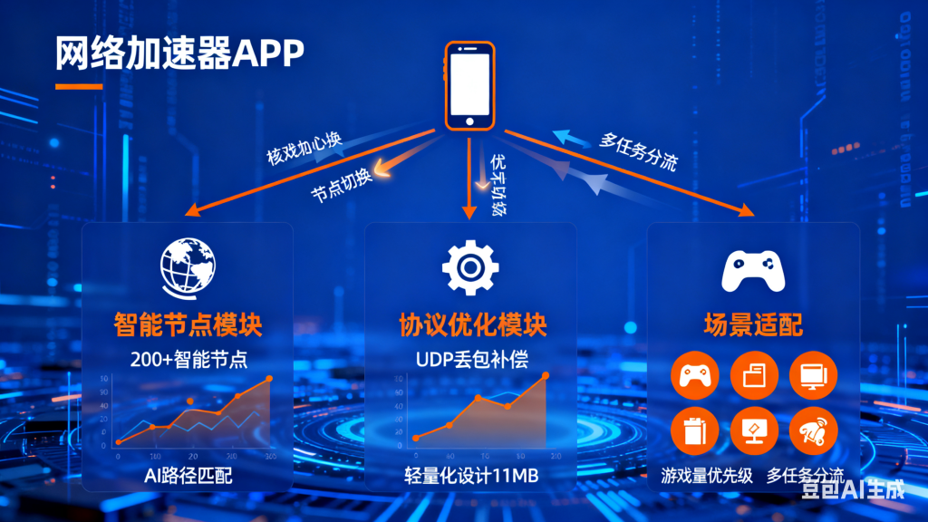 网络加速器 APP 的技术核心是 “轻量化适配 + 精准加速”,针对手机网络波动大、性能有限的特点设计优化方案,三大技术支撑体验升级: